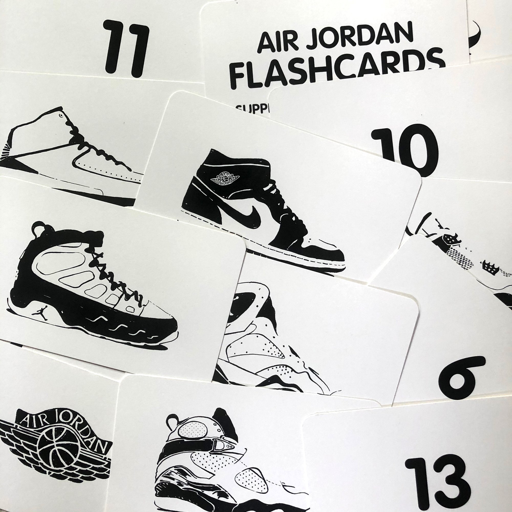 Following the format of traditional flashcards used in elementary school, each card has a hand drawn Jordan on one side with corresponding number on opposite side.